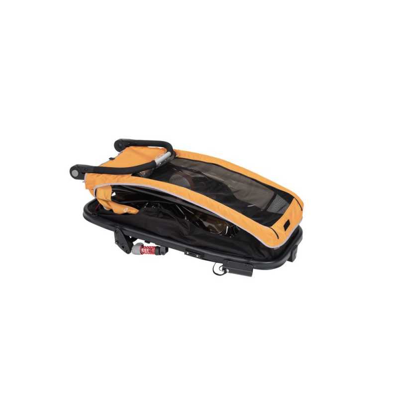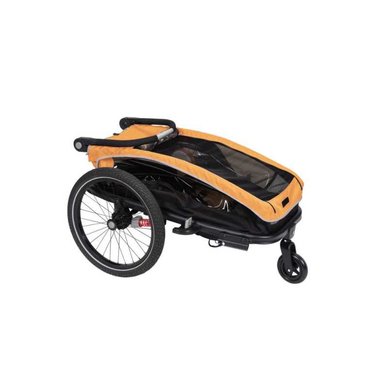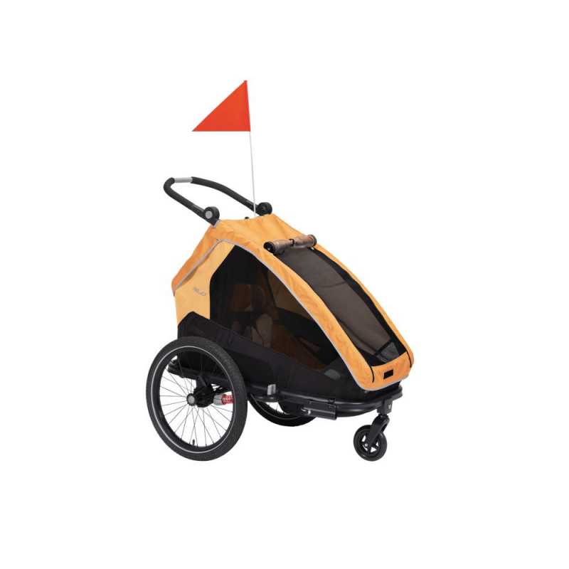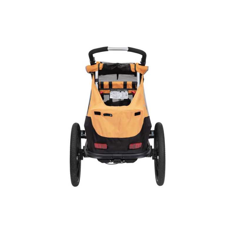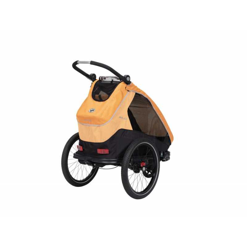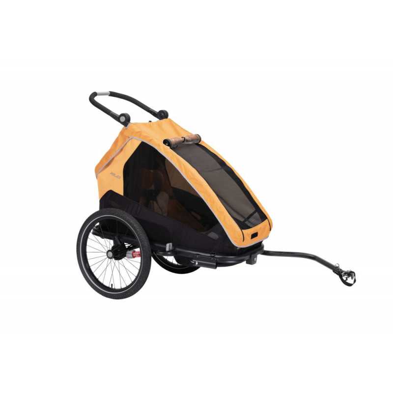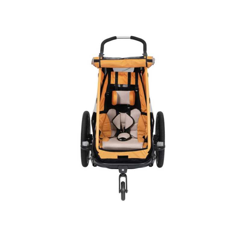 Praktický XLC DĚTSKÝ VOZÍK MONO S BS-C09 pro jedno dítě v atraktivní žlutozlaté barvě je dodáván v praktickém bike setu pro jízdu na kole i s buggy kolečkem pro přestavbu na běžný kočárek.