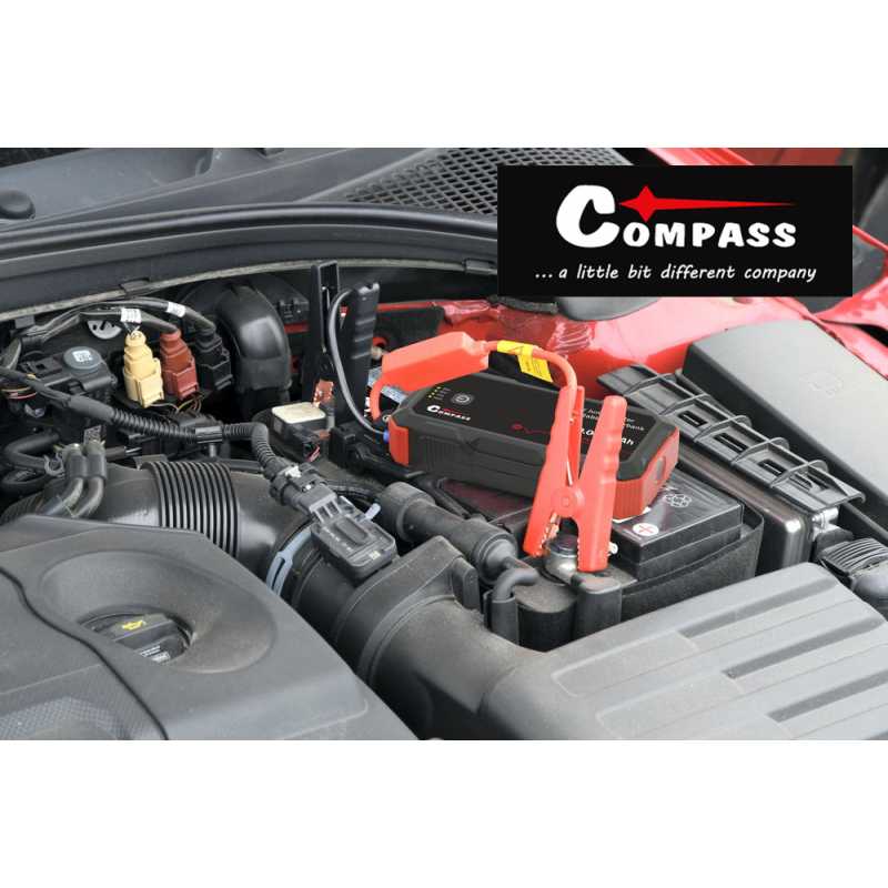 Powerbanka značky Compass s funkcí nouzového startování vozidla JUMP STARTER, s LED displejem zobrazujícím aktuální stav nabití a dalším příslušenstvím.