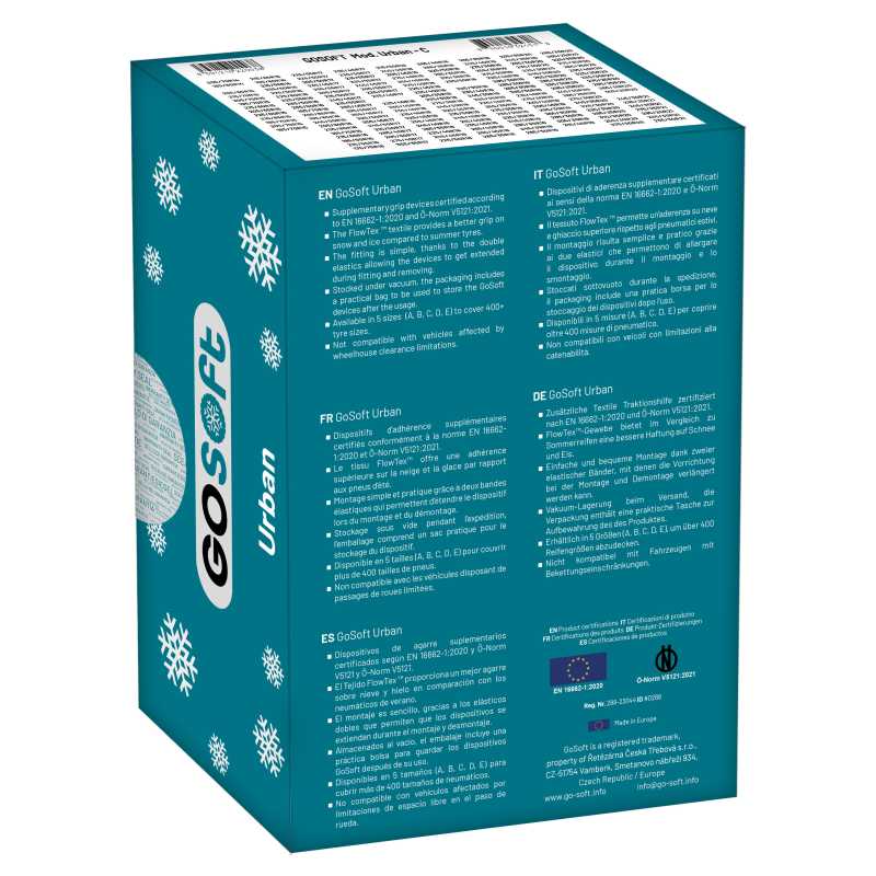 Textilní sněhové řetězy GOSoft Urban velikost B jsou jednoduché návleky na pneumatiku, které jsou vyrobené z textilie s cílem zvýšení přilnavosti pneumatiky při řízení vozidla na náledí nebo na zasněžených silnicích. Hlavní předností těchto sněhových řetězů oproti klasickým řetězům je rychlé a snadné nasazení i sundání, velmi podobné navlečení ponožky na nohu. Splňují normu Ö-Norm V5121:2021.