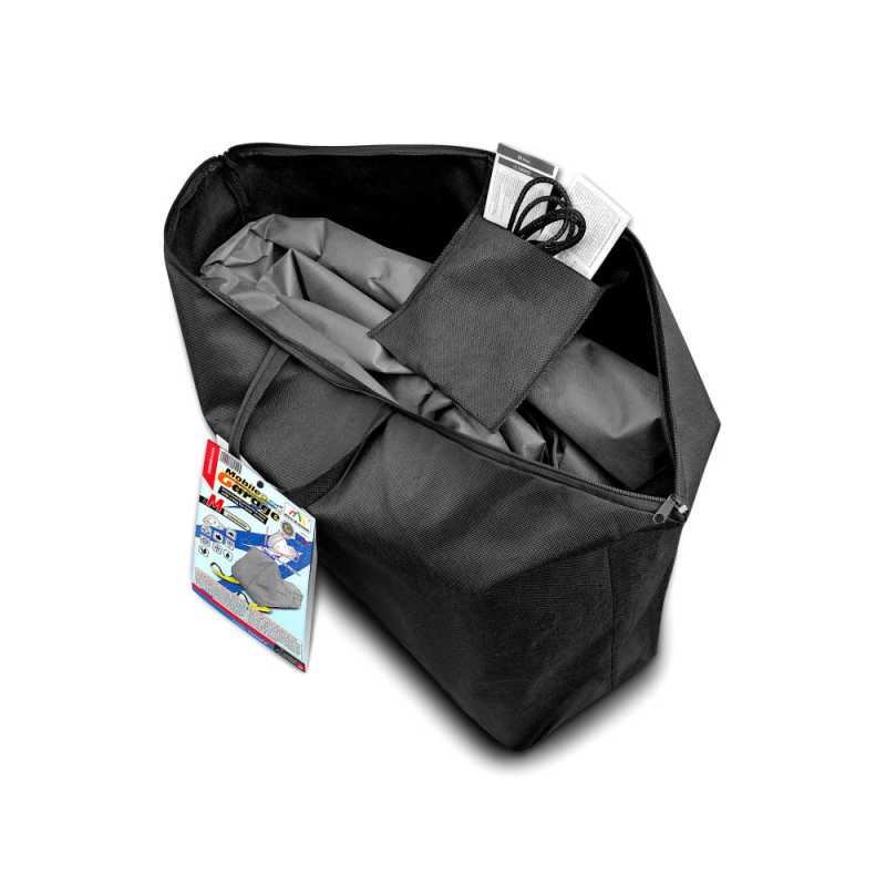 Nepromokavá krycí plachta na sněžný skútr Mobile Garage L 310/90/127 parkovaný venku k jeho ochraně proti nepříznivým povětrnostním podmínkám. Vhodná také k použití uvnitř budov.
